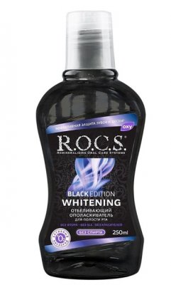 Сочетание отбеливающей зубной пасты с использованием нового ополаскивателя R.O.C.S.® Whitening Black Edition позволяет существенно (70-90%) повысить эффективность отбеливания зубов, за счёт содержания активного кислорода.